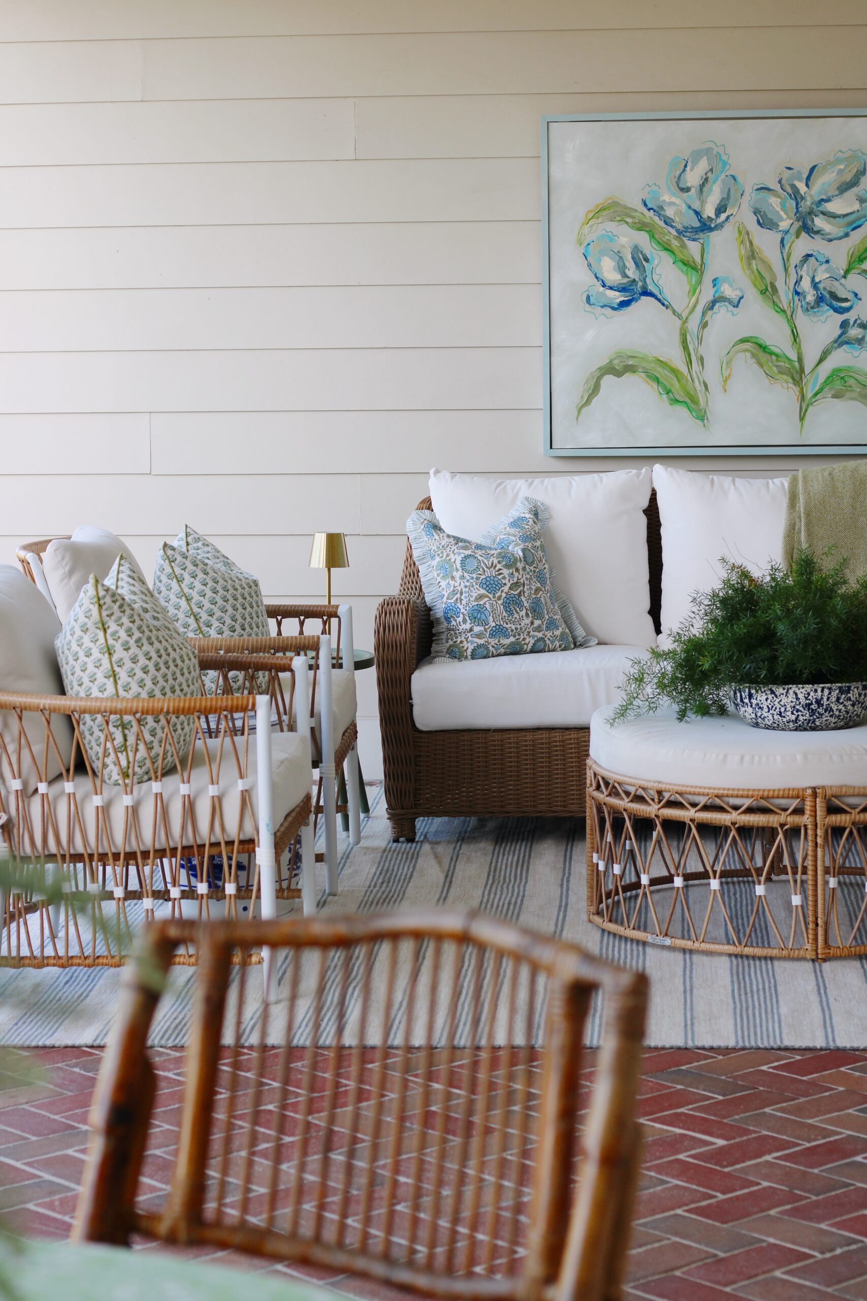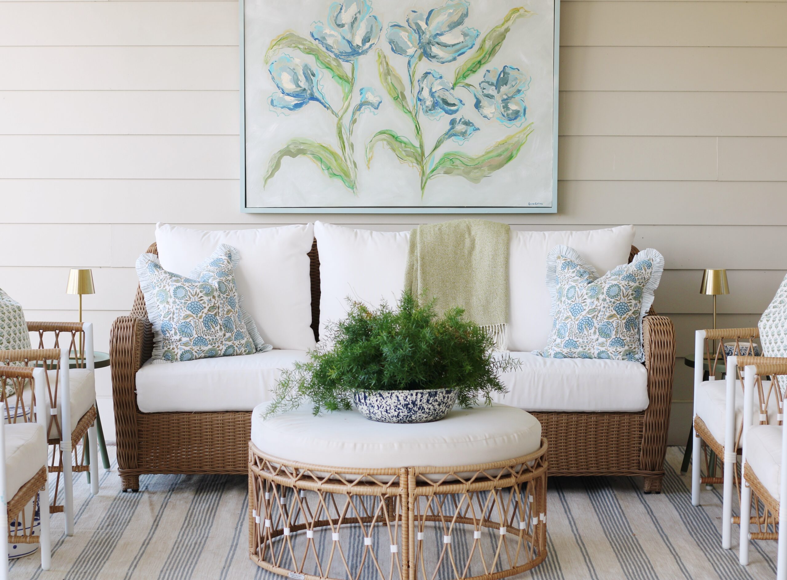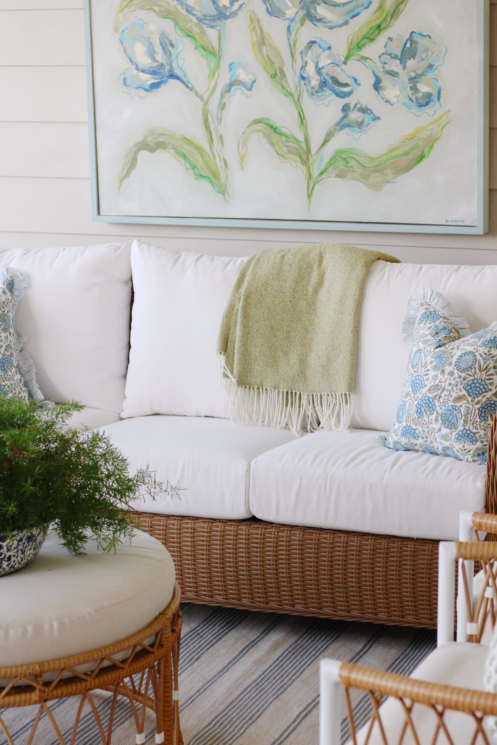 Right above it, we added a commissioned piece by Emma Collins, and it might be my favorite detail of the entire space. It brings so much personality and whimsy and really makes the porch feel like an extension of our home instead of just an outdoor area.