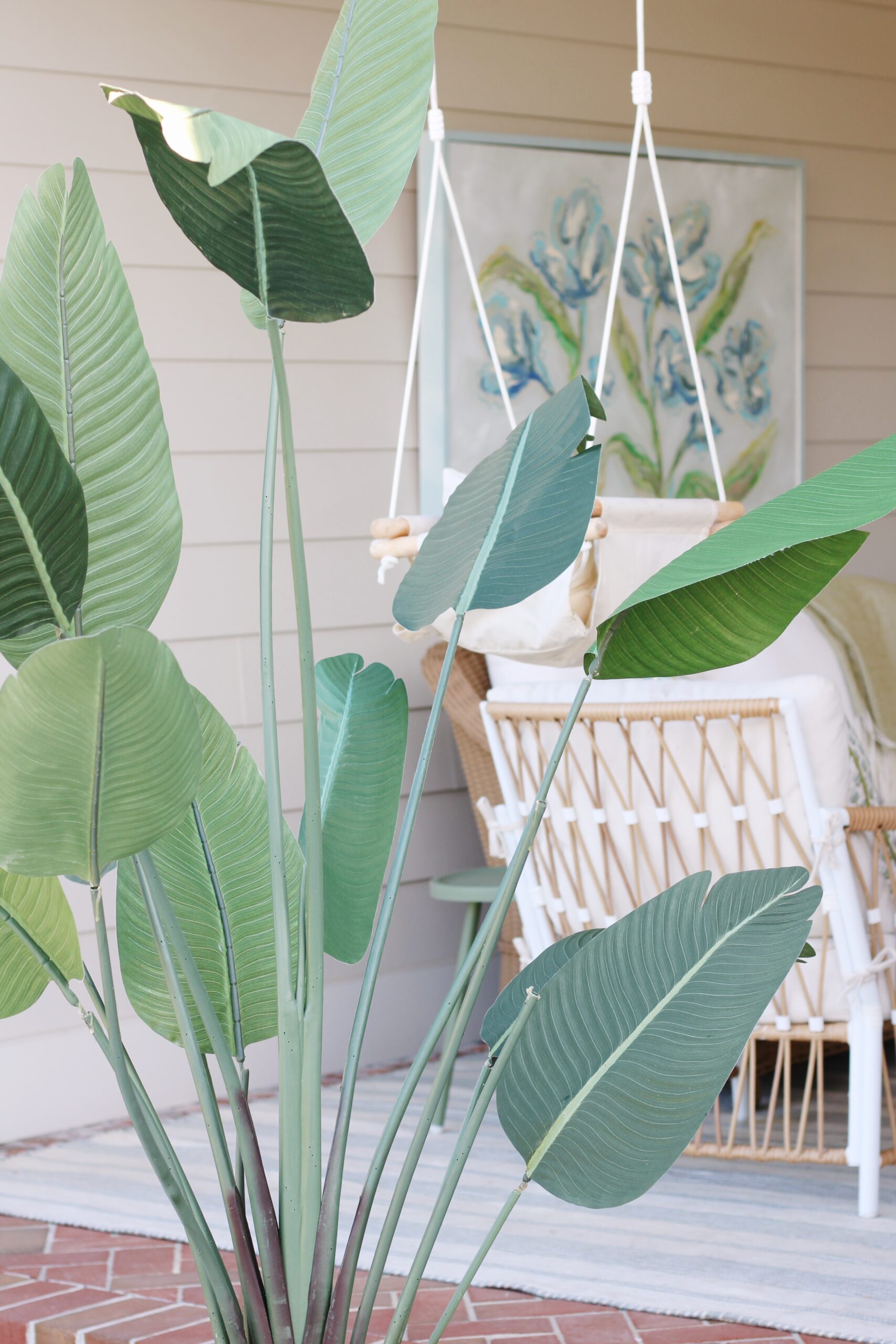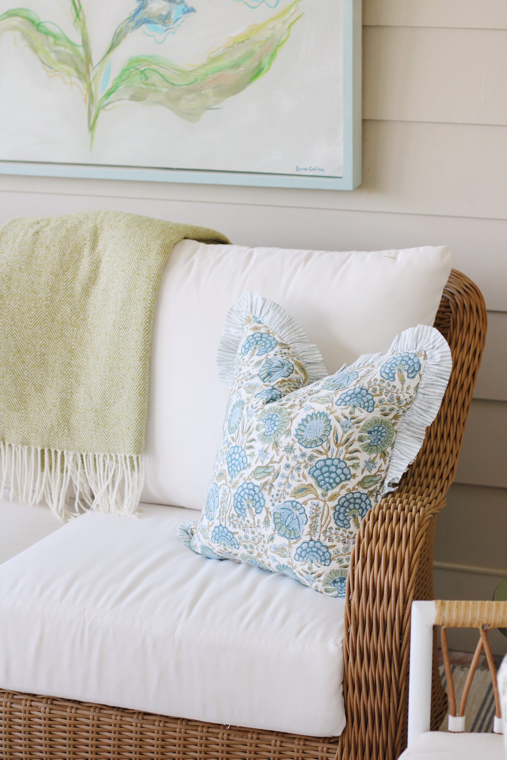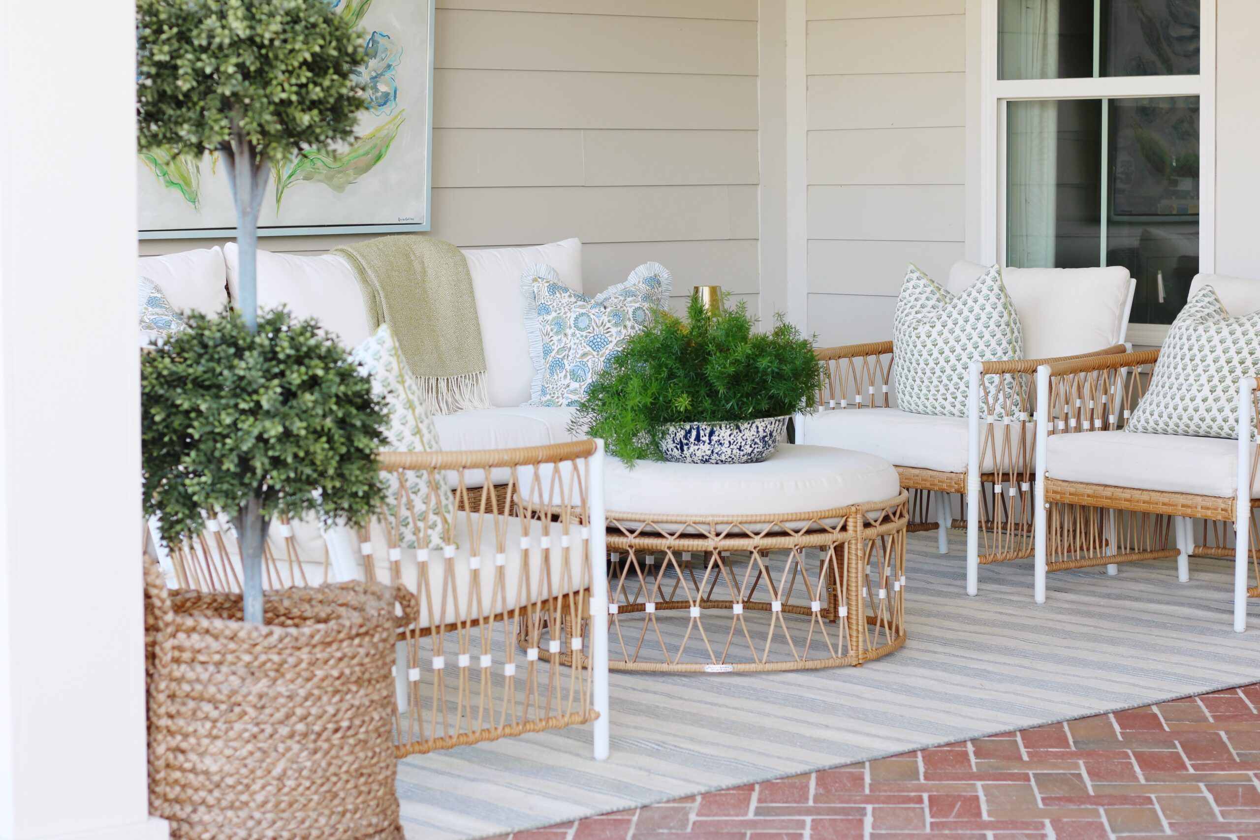 Right above it, we added a commissioned piece by Emma Collins, and it might be my favorite detail of the entire space. It brings so much personality and whimsy and really makes the porch feel like an extension of our home instead of just an outdoor area.