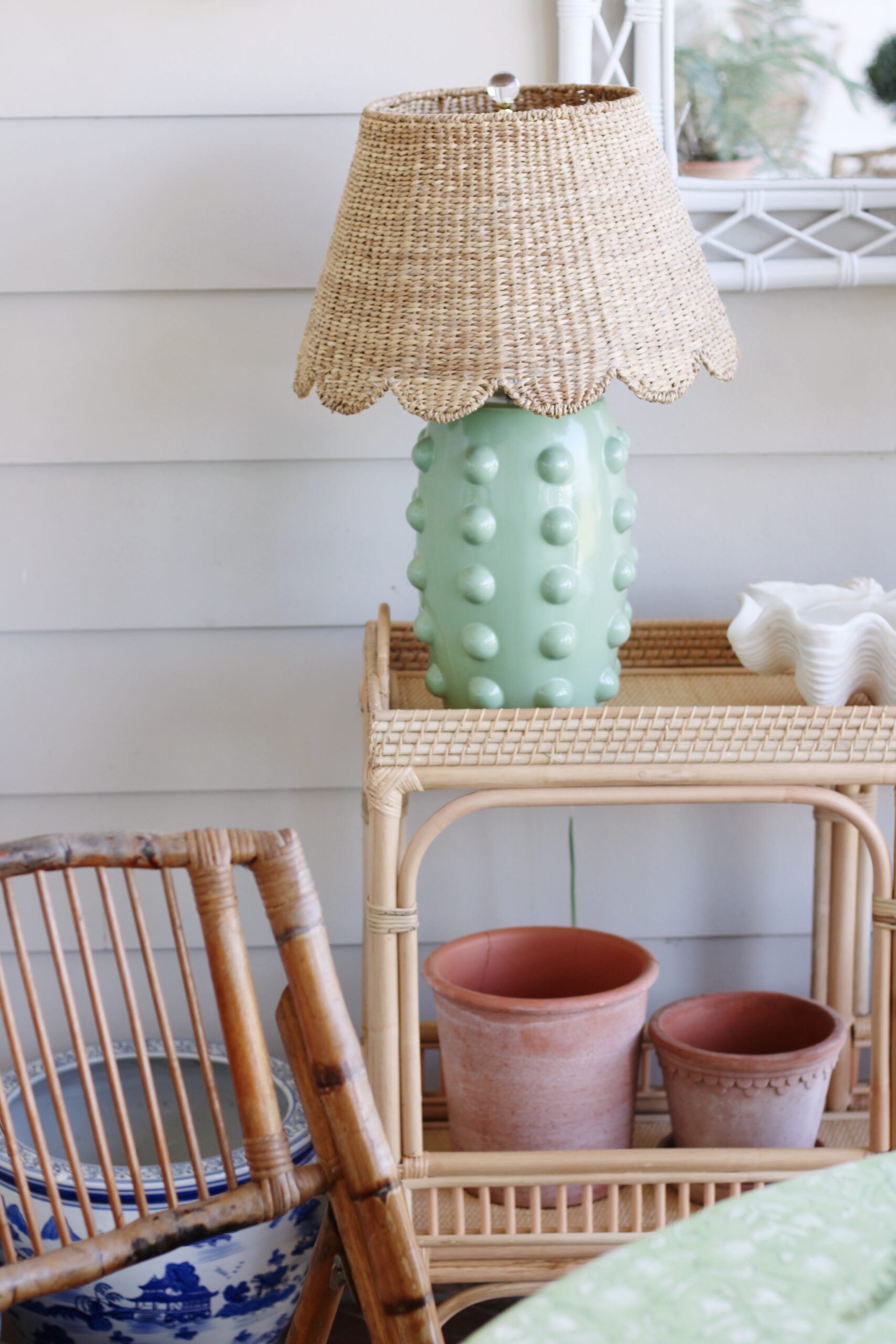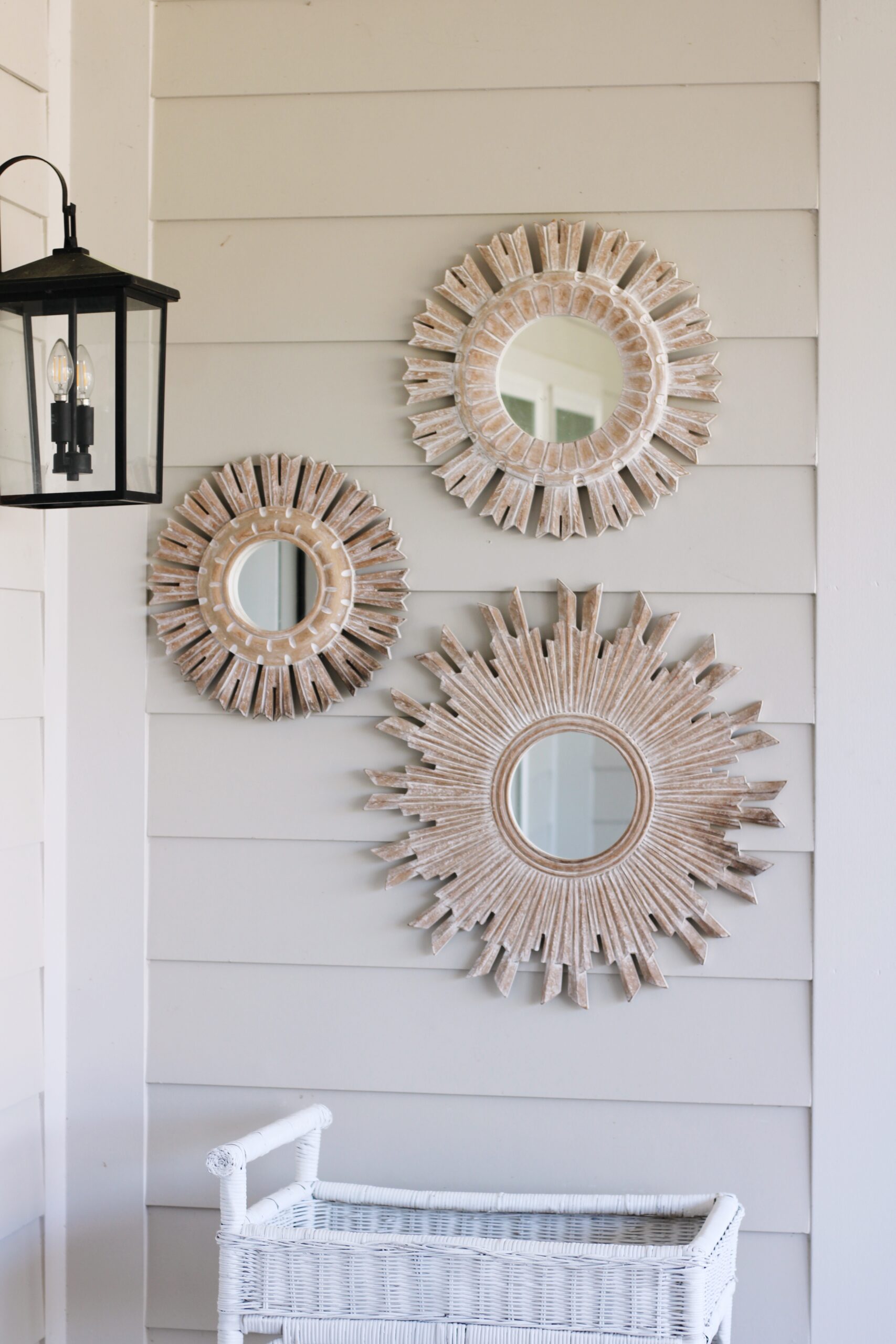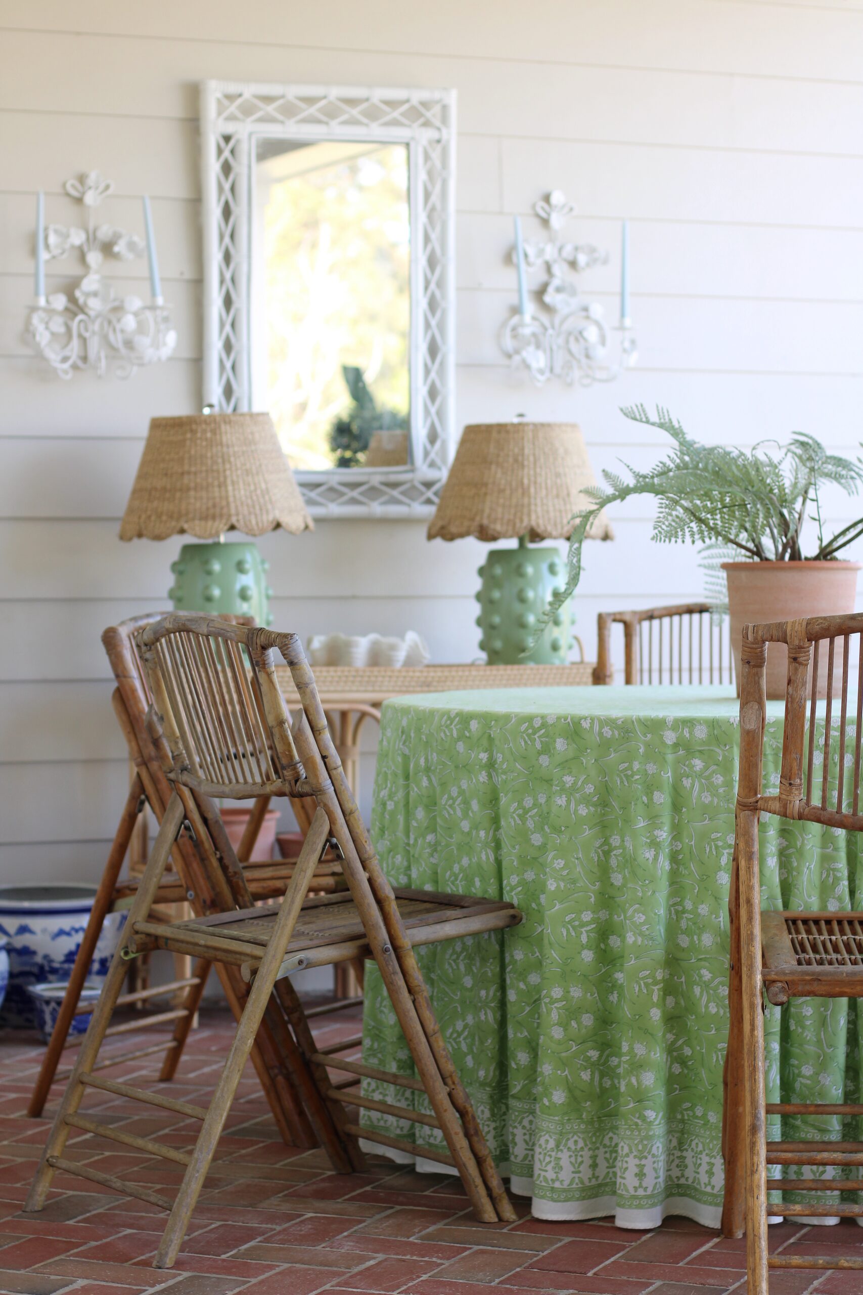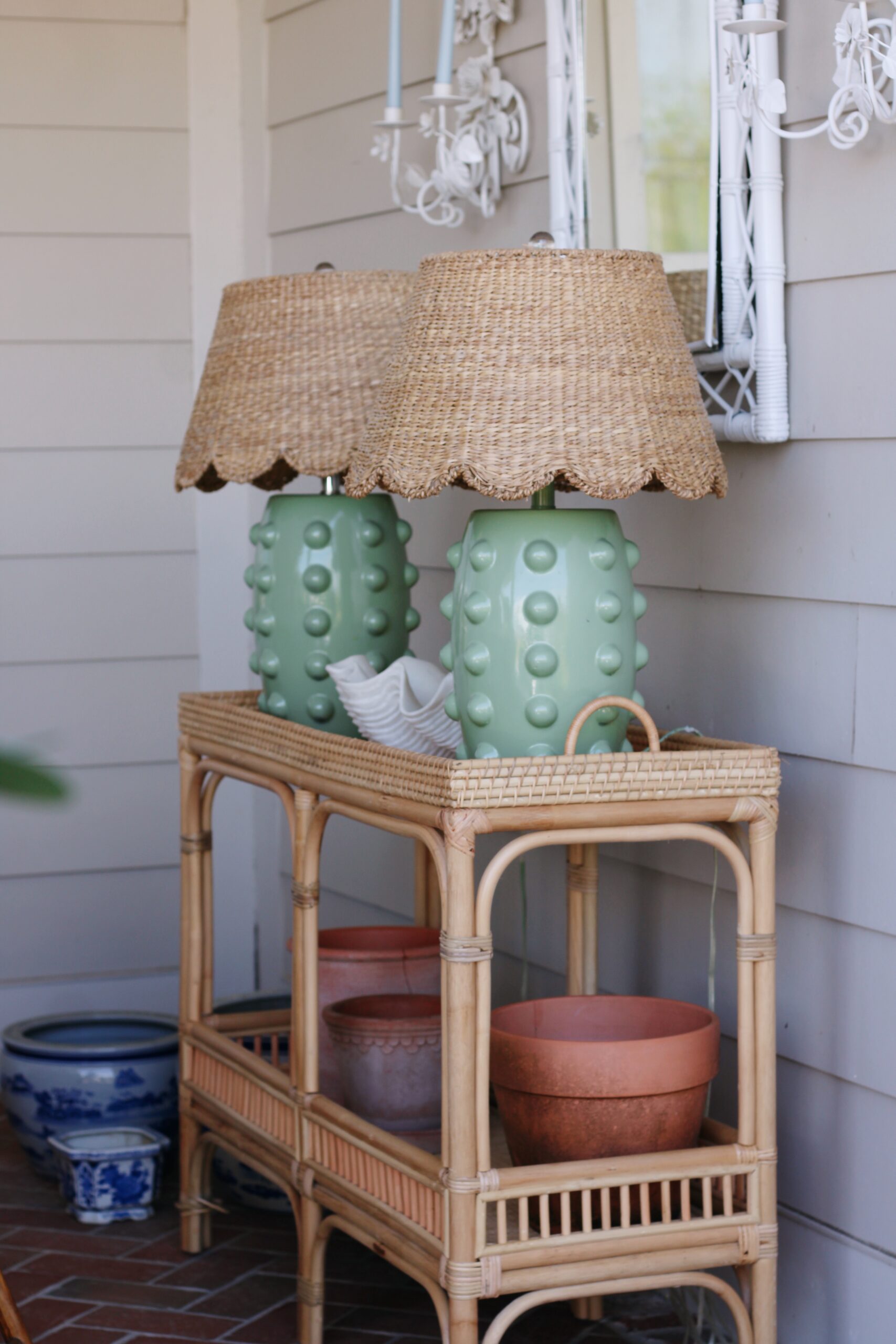 One thing I’ll note—your outdoor space doesn’t have to be filled with all brand new pieces to feel finished. Some of my favorite details out here are actually older, well-loved finds that we’ve collected over time. I refreshed a Facebook Marketplace mirror and a set of candle sconces with a $6 can of spray paint to give them a second life, and did the same with my wicker bar cart (a hosting staple around here!). Mixing old and new is what really makes a space feel layered and lived-in in the best way.